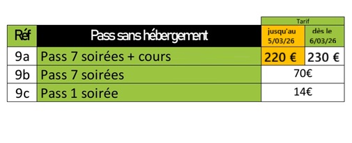 Au programme: stage de danse en matinée (réparti sur 8 pistes) et soirées latinos (SBK) tous les soirs !